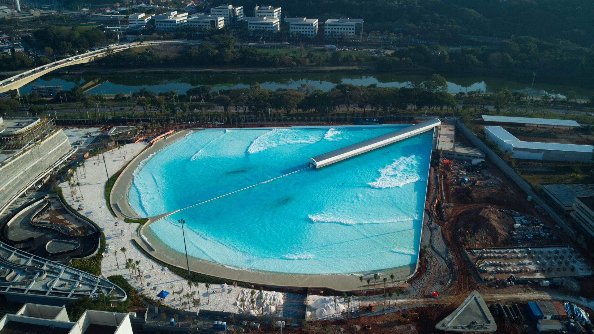 Vista aérea da piscina de ondas do Beyond The Club, na zona sul de São Paulo (Foto: BTC/Divulgação)